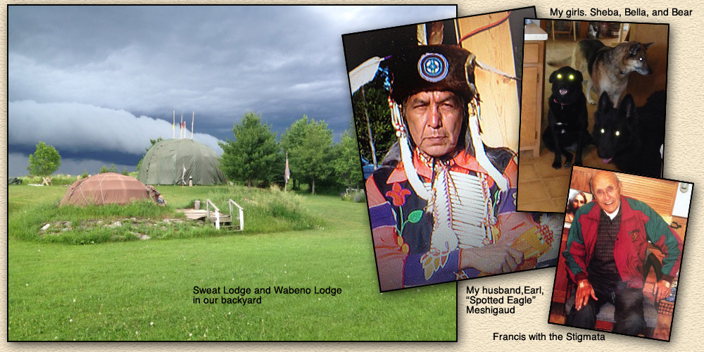 I received the name Aiesha which I use today. I have traveled all over giving spiritual development workshops, teaching meditation and training healers. I met my husband on one of those trips. Love at first sight! We lived in Rockford, ILL for 2 yrs. He wanted to move back to his tribe to help them. So we moved to the Hannahville Potawatomi Indian Reservation in the Upper Peninsula of Michigan where we ran The Community House for 5 years taking in troubled kids first and then adults. The Rez has major drug/alcohol and suicide problems. They cut the funding for the program. We were allowed to keep the house and we have continued to help the community here as spiritual leaders and medicine people. We do not charge for what we do.....we are only the Creator's helpers. We have been here almost 20 yrs and it has been very difficult yet extremely rewarding. My husband, Earl Meshigaud, is now the Cultural Director for the tribe and sits on council.