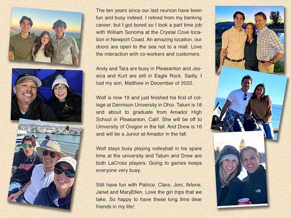 Was a stay at home Mom with Matthew, Jessica and Andrew until Andy started school. After moving back from Mammoth Lakes I then went to work in the banking industry, winding up with City National Bank for the last 20 years of my career. Loved my job of lending money to small businesses and watching them grow.
