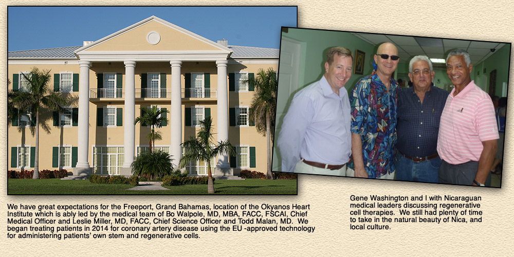 I am equally excited about the for-profit side of life...I have been involved in commercialization of autologous stem and regenerative cells for the past five years. A great deal of work by our team has resulted in the opening of the Okyanos Heart Institute in 2014 in the Grand Bahamas. Okyanos is the leading cardiac treatment center using adult stem cells. |