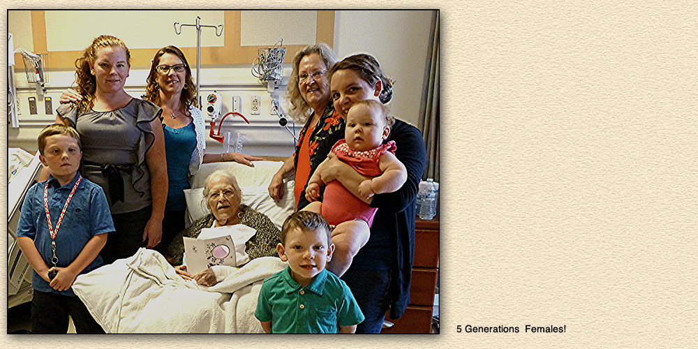 As my children grew, they began new lives, as they are supposed to do. My daughter gave me three granddaughters, two redheads and one with lovely ash brown hair. The middle granddaughter was killed in an auto accident at age 18 but the other 2 have made me a great grandma 3 times over with another ggchild due in March. They are Emmeline 1, Mattix 5 and Mason almost 8. We don’t know much about our little March bundle yet. Finally 2 boys in this generation, and counting. My son and his wife have no children, but their pets fill in nicely. Our family is truly blessed as our matriarch is still with us. My mom, Betty just celebrated her 92nd birthday last April. She’s quite frail, but as you can see below, still happy to visit with her descendents.