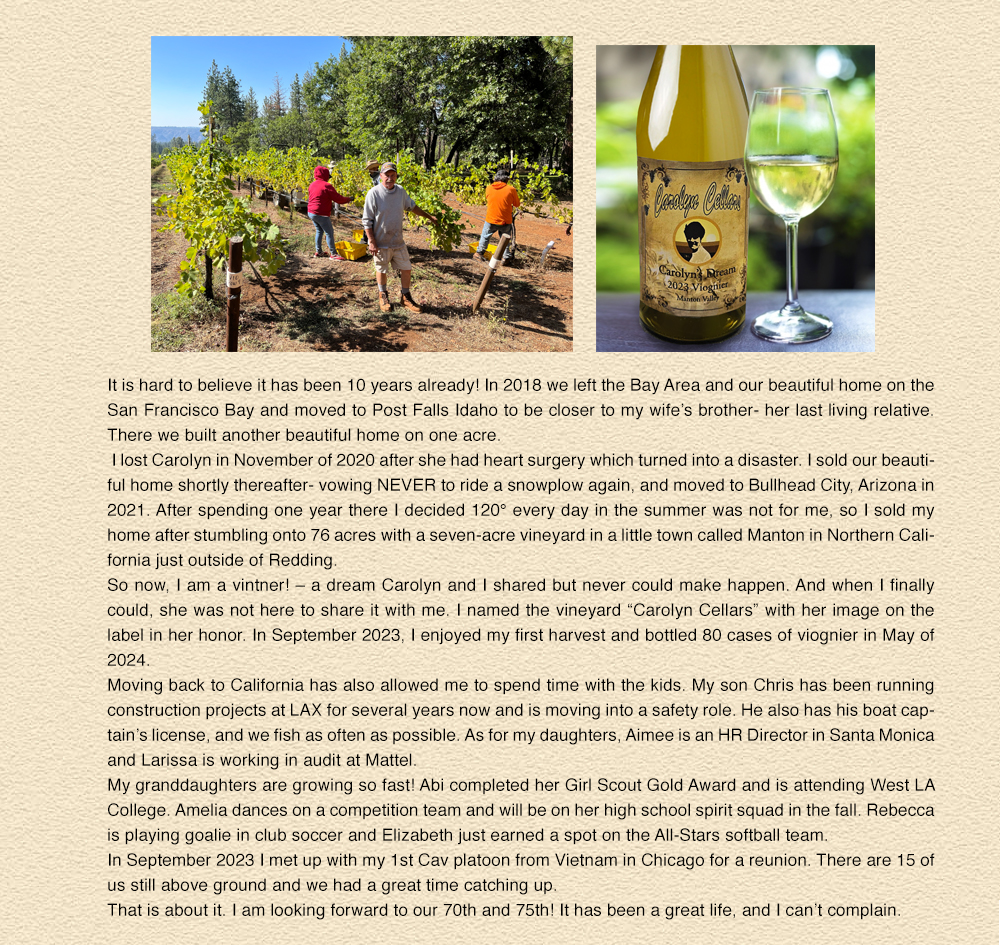 December, 1968, I was drafted into the U.S. Army. My year in Vietnam would define my views and values for the next 45 years. I always joked I had a “grass roots” approach to the Vietnamese problem spending my year in the “bush”. I spent the last 5 months leading an infantry rifle platoon with the 1st Cavalry Division, and was awarded the CIB and two bronze stars for valor. We had a saying “that you have never lived until you have fought beside the men who have died for it—life has a taste the protected will never know”. Those of us that were in combat know only too well how precious life is, and cherish every day forward.