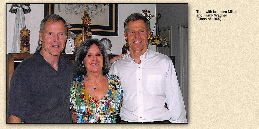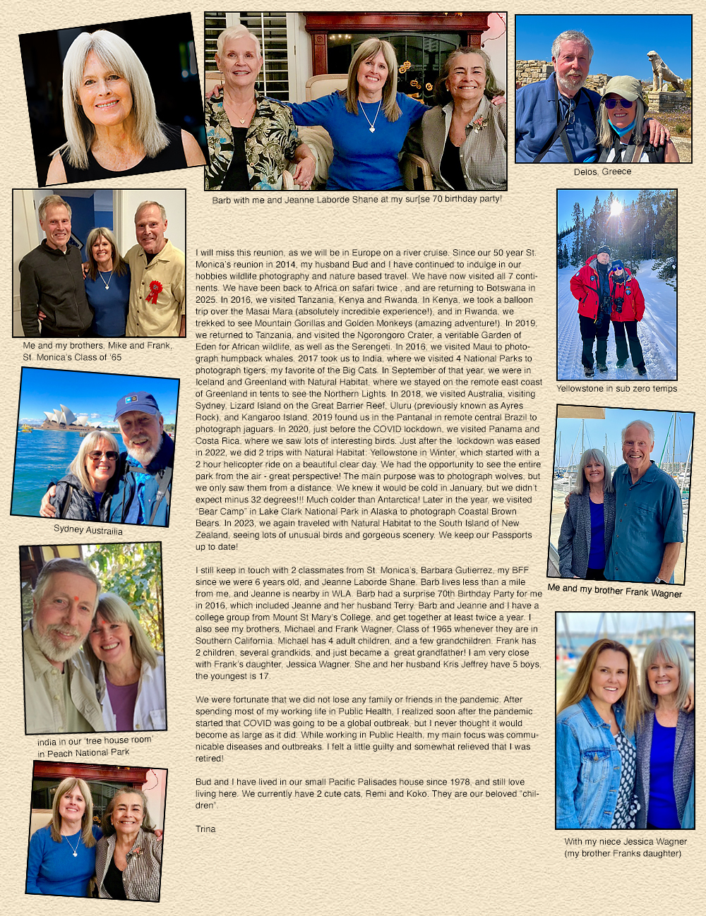Bud continues to work, as he enjoys it. He was in charge of “Health Facilities”, the section of the Health Department that inspects hospitals for Licensing and Accreditation. He was then recruited by Kaiser to do a similar job for them. Finally in 2004, he was recruited by a private company in the Boston area that provides consulting services to hospitals all over the U.S. Luckily, we did not have to move to Boston. We were fortunate to buy a house in Pacific Palisades shortly after we were married. We are still there, with no plans to move. We do not have children, but are aunt & uncle to several nephews and nieces, the children of my brothers, Mike & Frank Wagner, St Monica’s Class of 1965. We now have grand-nephews & grand-nieces as well. Our only “babies” are our 3 cats!